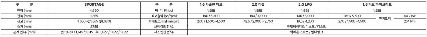 기아 스포티지 가격표 제원 (1.6가솔린 2.2디젤 하이브리드)