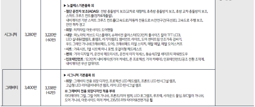 옵션사양입니다. 공부해야 될 수준으로 참으로 복잡하네요. 개인적으로는 네비게이션과 드라이브와이즈는 필수로 하기를 추천드리고, 추가로 하이테크, 모니터링팩 정도를 추가하면 좀더 최신의 사양을 체험가능합니다.