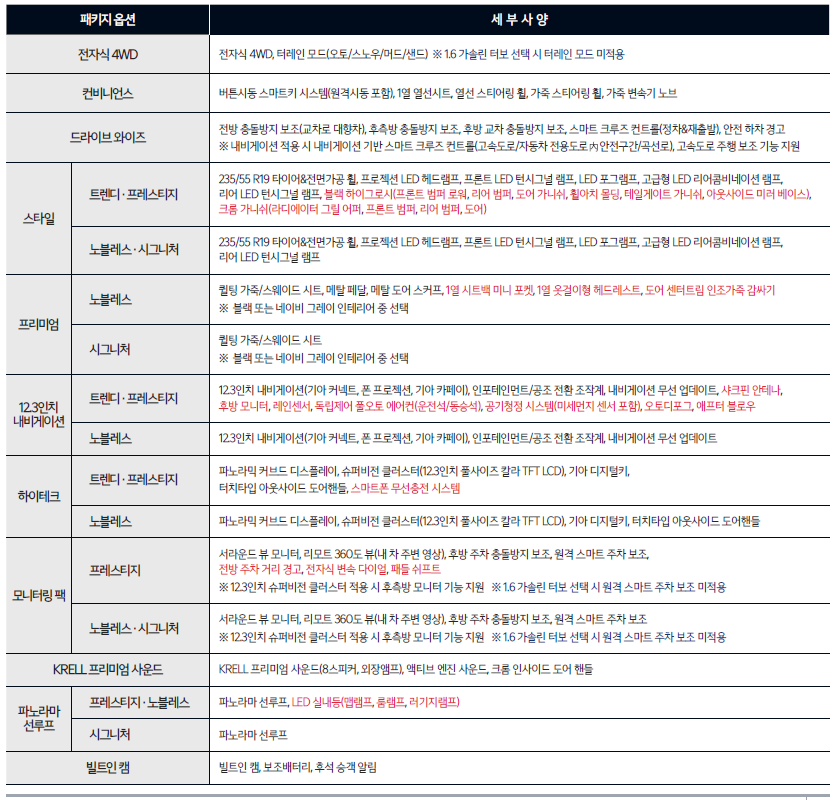 대표엔진모델인 1.6터보와2.2디젤은 기본적으로 트림과 옵션구성이 동일합니다. 입맛대로 골라서 하시면 될듯하고. 현대기아자동차의 가성비는 뭐니뭐니해도 드라이브와이즈와 12.3인치 네비게이션 옵션 두개만 하는것입니다. 이렇게 구성할경우 프레스티지트림은 3000만원 안쪽으로 구매가 가능하죠. 빌트인캠은 차세대가 아니라면 추천하지 않습니다.