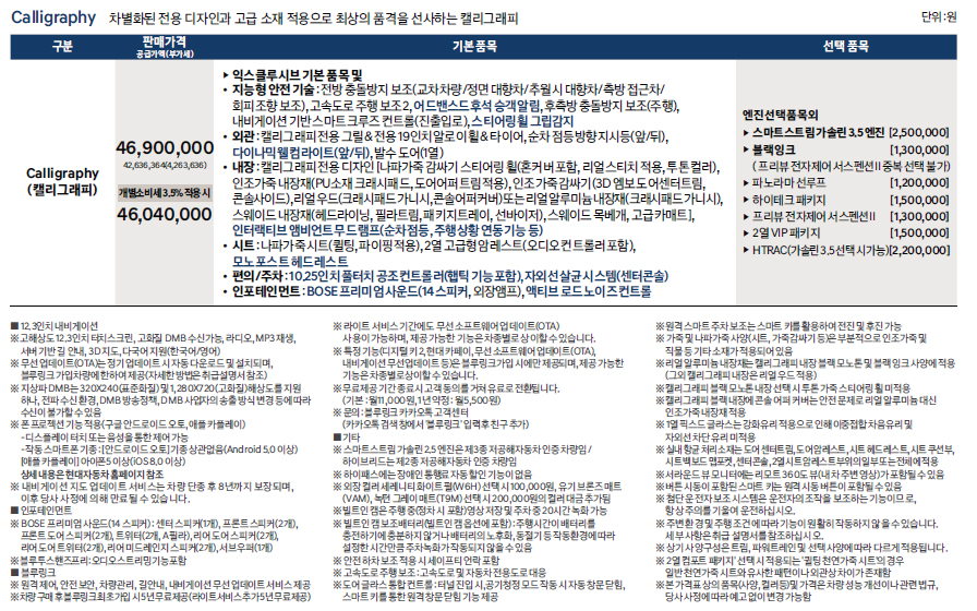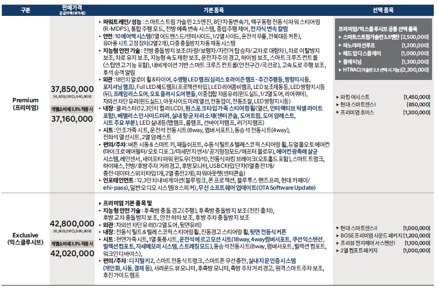 이전모델에 비해 많이 올랐습니다. 그만큼 첨단 사양과 옵션으로 무장되어있고, 특히 더더욱 커진 외관에 프레임리스창을 채택하고 풀led 렘프를 적극적으로 사용하면서 가격상승의 이유가 될수는 있겠지만, 엔진사양은 기존그대로라는것이 좀 아쉽습니다. 3716만원부터 시작하지만, 이가격에 구입할 분은 많지 않을걸로 보이고, 개인적으론 익스클루시브 모델에 스마트센스옵션정도만 넣어서 하면 적당히 가성비로 운행할수 있을걸로 보입니다. 2.5엔진이 아쉽긴한데, 3.5로 가려면 캘리그래피로 가야되서 갑자기 거의 5천만원에 육박하는 가격이 되는군요.