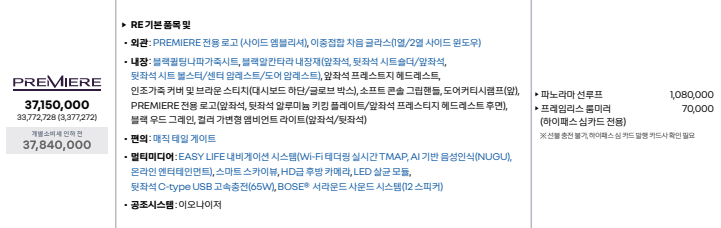 큰틀에서 옵션은 많지 않습니다. 기본적용이 많은 편이라 그렇고요. 기본모델에 추가하는옵션은 안전옵션인 드라이빙 어시스트패키지 , 인포테인먼트 시스템등이 저사양트림에서 필수로 넣으시면 좋을듯합니다. 고급트림인 프리미에는 7만원짜리 룸미러만 추가하시면 되겠네요.