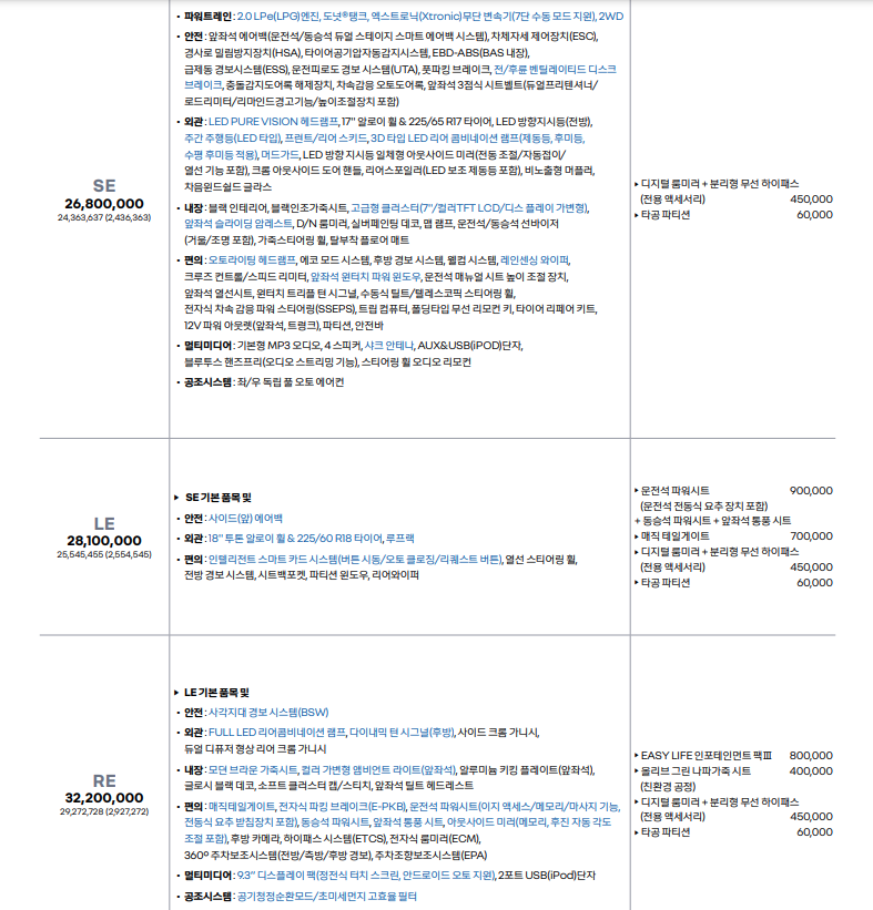 도넛연료통으로 유명한 LPG모델 가격입니다. 엔진제외하면 가솔린모델과 동일합니다. 옵션의 경우 LPG모델은 보스오디오 옵션이 아예 선택할수 없네요. 도넛연료통때문인걸로 보입니다.
