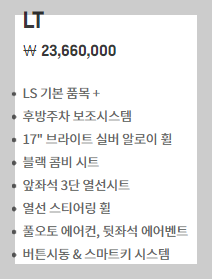 • 영업사원 : LS트림 추천드립니다. 위와 마찬가지로 회사에서 쓰는 차량은 무조건 가성비로 고를수밖에 없는데 최강의 가성비인 LS트림을 추천합니다.