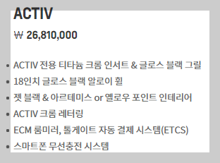 • 아이1명 메인차량 : ACTIVE 또는 RS 추천드립니다. 여기에 전동테일게이트추가하면 저가차량이미지도 상쇄되고 외부디자인도 세련되서 충분히 메리트가 있습니다. 더군다나 소형SUV 등급에서 최대 실내사이즈인만큼 아이1~2명정도는 충분히 편하게 탈수 있을듯합니다.