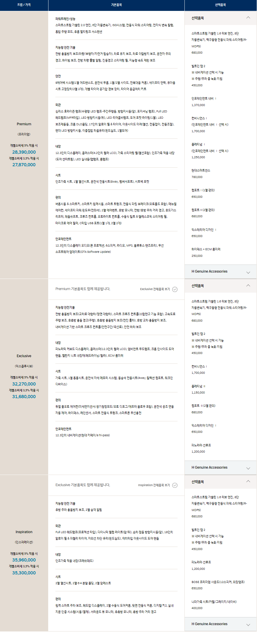 | 익스클루시브 | 1.6터보엔진,8단변속기옵션 컨비니언스1 빌트인캠2 |
