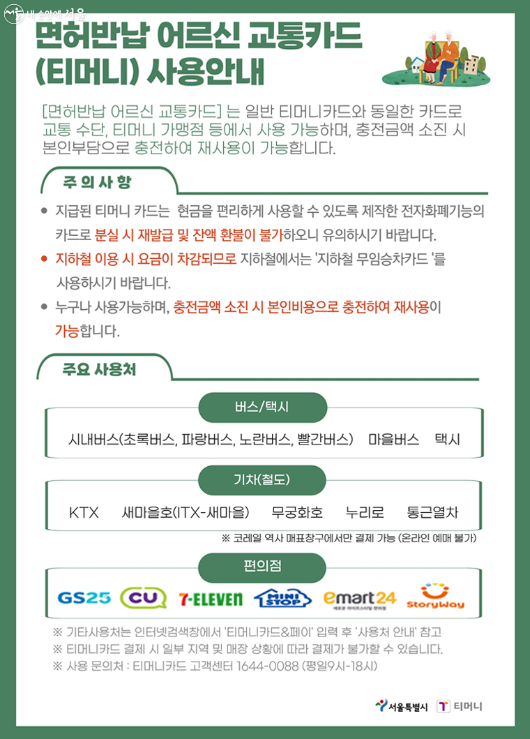 전국 어디서나 사용가능합니다. 다만, 지하철의 경우는 65세이상 어르신에게 무료승차제도가 있으므로 어르신 무료 교통카드를 사용해야 요금차감이 없습니다. 또한 교통카드용도뿐아니라 전국 편의점등 티머니가맹점에서 사용할수 있습니다.
