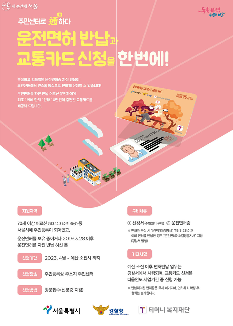 서울시에서는 2023년에 운전면허 자진반납하시는 어르신분들께 선불 교통카드지원사업을 시행합니다.