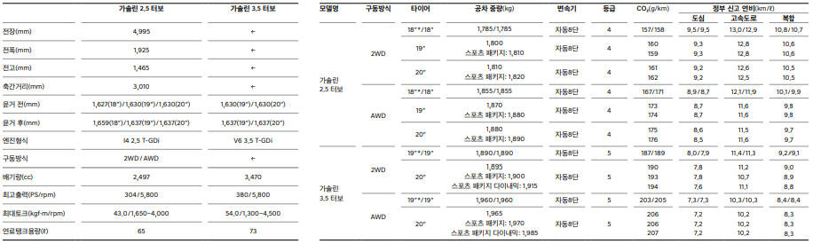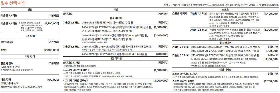 엔진은 2.5가솔린터보와 3.5가솔린터보가 장착됩니다. 각각 후륜 사륜 선택이 가능하고 스타일패키지를 하면 전자제어서스펜션과 20인치 휠로 업그레이드도 가능합니다. 2.5터보면 일상영역에서는 차고넘치는 스펙입니다. 300마력이 넘는 출력에 43토크의 아주 넉넉한 파워를 보여줍니다. 좀더 스포티한 성향이라면 스포츠트림에 3.5터보면 스포츠카에 버금가는 훌륭한 주행감을 느낄수 있습니다.