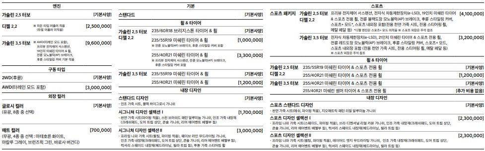기본모델에 필수옵션을 보시면 되는데 2.5터보그대로 하신다면 추가금액은 들지않습니다. 디젤은 250만원, 3.5터보는 960만원을 추가해야 합니다. 거기에 사륜을 선택하게 되면 300만원이 추가됩니다.