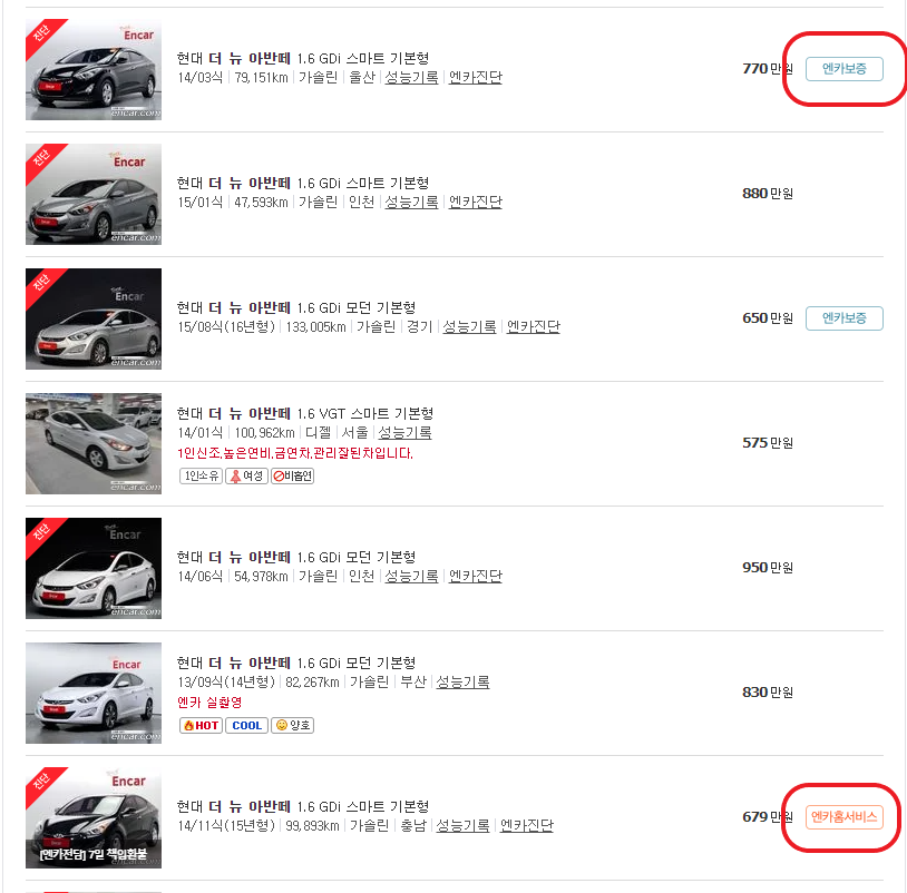 엔카를 기준으로 설명드리겠습니다. 일단 사고싶은 차량을 고릅니다. 아반떼를 골랐다고 하고 보도록 하겠습니다.