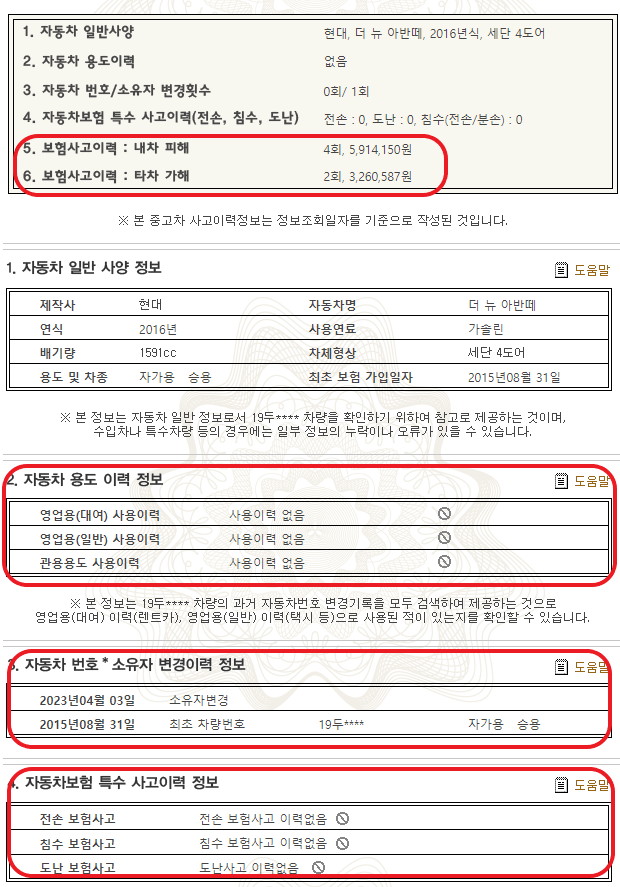 아래 용도이력의 경우 영업용사용이력에 체크가 되어있다면 되도록 피해가는것이 좋습니다. 렌트카인경우에 차량상태가 좋지못한 경우가 많습니다.