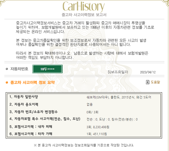 외 이걸보냐하면 각 중고차 딜러사들은 차량을 매입하면 그차량에 대해서 문제가 있는지 또는 보험은 어떤부분에서 사용이 되었는지 조회를 하게됩니다. 그러면 보험이력이나 자동차 검사를 한 날짜가 나오게 되는데 그 날짜로 대충 이차량을 매입한 날짜를 알수가 있습니다.