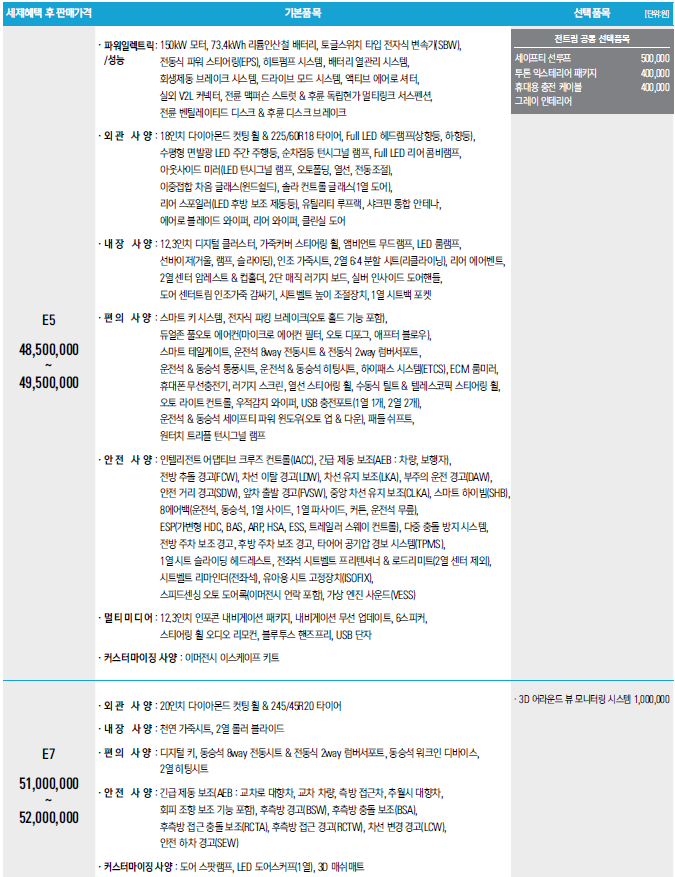 모델은 E5, E7두 가지인데, 기본적인 배터리 등 파워트레인은 동일하고 외관 디자인과 편의사양등에서 차이가 있습니다. 다만, 어라운드뷰는 E7에서만 선택가능한 것은 아쉽네요. 대략 보조금적용 후에 3000중 후반 시작~4000 초반까지 형성될 것으로 보입니다. 전기차 입문용으로도 매우 가성비는 좋을 걸로 보이네요. 다른 모델보다 스피커에서 좀 부족한 모습인데 음악 많이 듣는 소비층이라면 조금 아쉬울 수는 있겠네요.