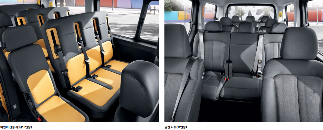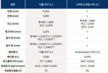 길이는 5255입니다. 카니발보다 조금 긴전장을 가지고 있고 전폭은 2미터에 육박하는 큰 차량입니다. 엔진사양은 디젤 2.2엔진과 lpg 3.5엔진이 준비되어있습니다. 디젤차량은 디젤답게 토크가 44토크에 달하고 출력은 177마력입니다. 아무래도 소상공인의 배달이나 납품등의 용도나 연비와 장거리운행용으로 적합할것으로 보이고요. 통학차량은 아무래도 조용하고 진동이 적은 lpg모델로 하면 좋겠네요.