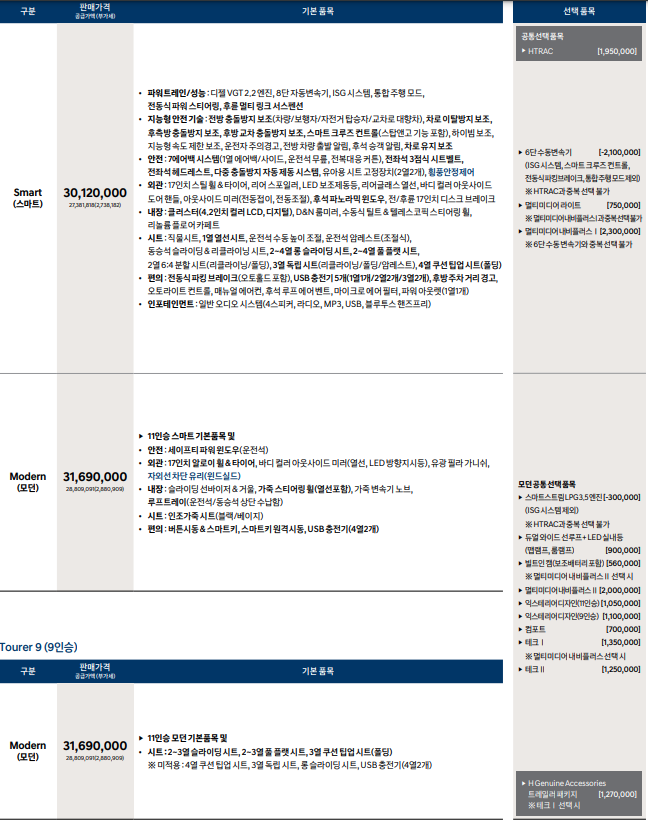 투어러 가격입니다. 기본 11인승으로 구성되어있습니다. 특이하게도 자동8단이 기본이고 6단 수동을 옵션으로 선택시 금액이 -210만원 저렴해집니다. 다용도로 쓰신다면 옵션이 들어간 모델이 좋을것으로 보이고 멀티미디어 네비 플러스 정도의 옵션만 넣어도 괜찮을거 같네요. 만약 장거리가 많은경우는 모던트림에 컴포트를 넣어서 통풍시트도 가져가시는게 괜찮을듯 합니다.