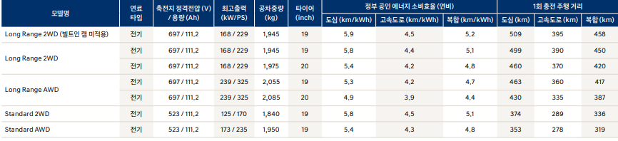 롱레인지 모델의 가격표입니다. 아무래도 스탠다드보다는 롱레인지쪽의 구매가 많습니다. 특별히 옵션구성이 없을만큼 전기차의 특성을 살려서 기본옵션이 풍부합니다. 지능형 4륜구동옵션인 htrac 과 컴포트, 스마트센스의 옵션이면 아주 훌륭하겠네요.