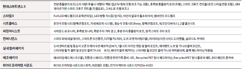공통적으로 트림별로 선택할수가 있고, 스마트센스2는 무조건 추가하시고, 스타일2와 컨비니언스 또는 파킹어시스트추가하면 될것같네요.