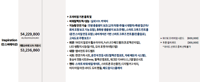 롱레인지 가격입니다. 4900만원대에서 시작하네요. 왠만한 옵션은 다 들어있어서 이대로만 구매하셔도 큰 불편함은 없을듯합니다. 인스퍼레이션은 사운드나 선루프, 빌트인캠2정도만 추가하셔도 상당히 가성비가 좋을것으로 보입니다.