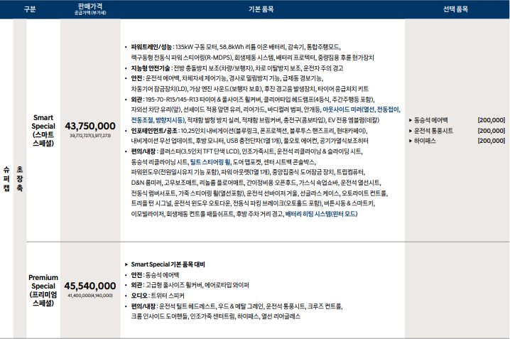 4375만원의 가격이 기본가격입니다.에어백이나 옵션은 3가지인데 왠만해선 모두 선택하는게 좋겠지요. 스페셜까지는 안가고 기본에서 옵션만 모두 추가해도 4435만원입니다. 정부보조금은 봉고3 와 마찬가지로 1200만원의 국고보조금이 지급됩니다. 거기에 지자체별 보조금을 추가로 받을수 있으므로 2000만원대에 포터2 일렉트릭을 구매할수 있습니다.