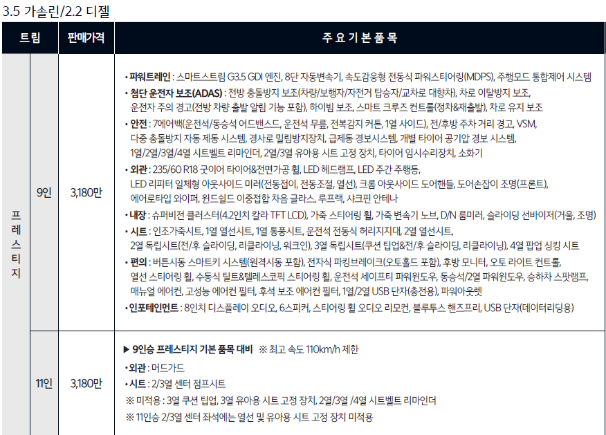 2.2디젤을 제일 많이 선호하고 있으나 최근에는 디젤의 불호성향으로 3.5가솔린의 수요도 많은 편입니다. 좀더 패밀리카에 맞는 조용한 엔진이기도 하고 힘과 관리측면에서도 유리하기 때문입니다.
