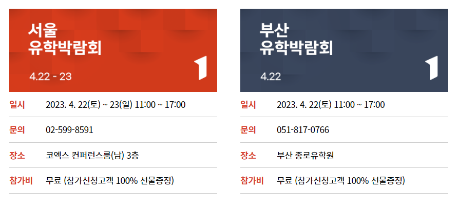 안녕하세요. 유학박람회가 서울 코엑스와 부산 종로유학원에서 진행합니다.