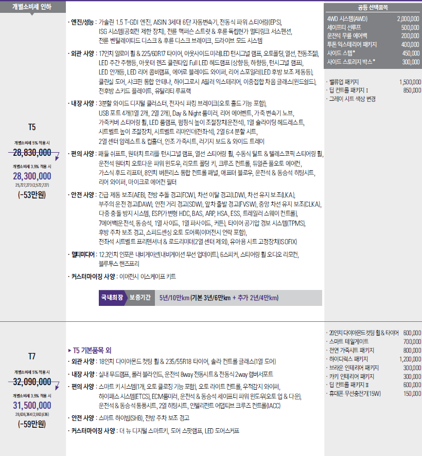 가성비가 정말 괜찮은 모델이라는생각이 듭니다. 개인적으론 추천트림은 T7에 전동식테일게이트만 옵션으로 넣을거 같습니다. 3000만원대초반에 이정도 가성비면 상당히 괜찮은선택이라고 생각합니다.