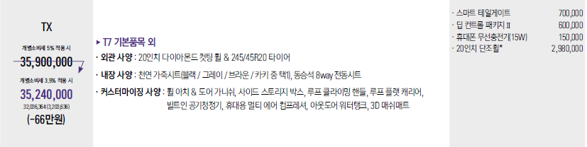 이번에 출시된 TX모델입니다. T7모델에서 옵션이었던 부분을 기본으로 적용시키고 보다 캠핑등 아웃도어에 적합하게 옵션을 추가할수 있게 만든 모델이 TX모델입니다. 가격은 기존모델보다 대략 400만원이 올라가면서 옵션추가시 4000만원을 바라보는 가격대인데 수요는 많은모델은 아닌듯합니다. 고급형모델이라고 보시면 되겠습니다.