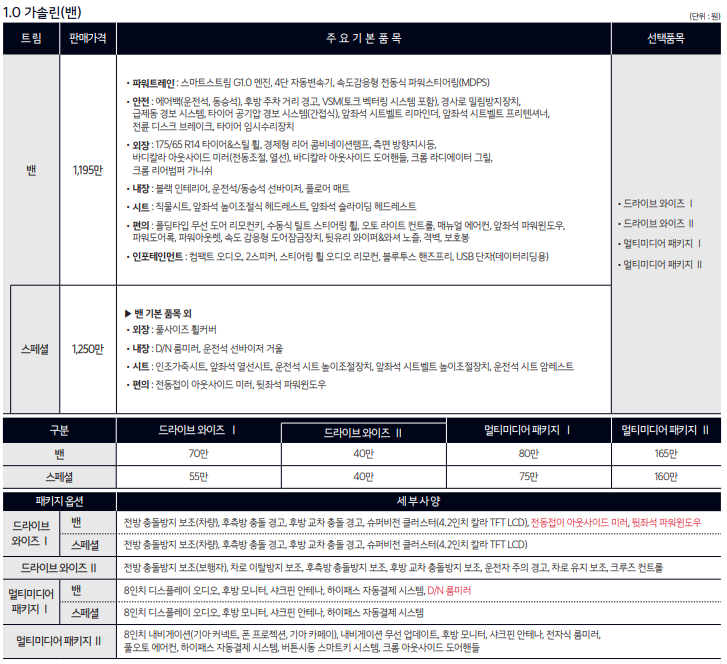 밴모델 가격입니다. 간소화된 가격표인데요. 일단 기본과 스페셜은 60만원차이지만 가죽시트, 열선시트 등 시트옵션에 전동접이식 사이드미러가 포함되어 무조건 스페셜로 하는게 좋겠습니다. 드라이브와이즈와 멀티미디어 패키지추가 하면 충분히 좋은 옵션을 누릴수 있겠네요.
