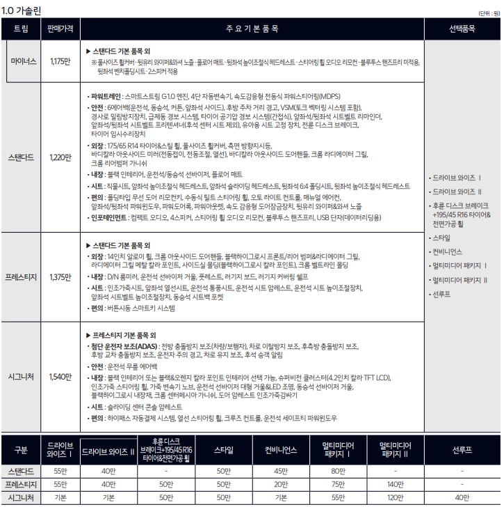 일반 모델 가격입니다. 끊임없는 사양변경을 통해서 현재는 최신의 편의사양까지 옵션으로 추가할수 있고, 왠만한 수입차량보다도 풍부한 편의장비를 자랑합니다. 풀옵션은 2000만원에 육박하다보니 가성비로는 비추천드리고 드라이브와이즈, 멀티미디어패키지정도만 추가하여 구매하면 충분히 가성비를 누릴수 있을것으로 보입니다.