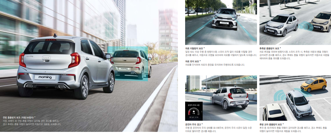 경차에 정말 많은 옵션이 들어갑니다. 후측방경고, 차로이탈방지가 들어가고 전방추돌방지보조기능이 들어갑니다.