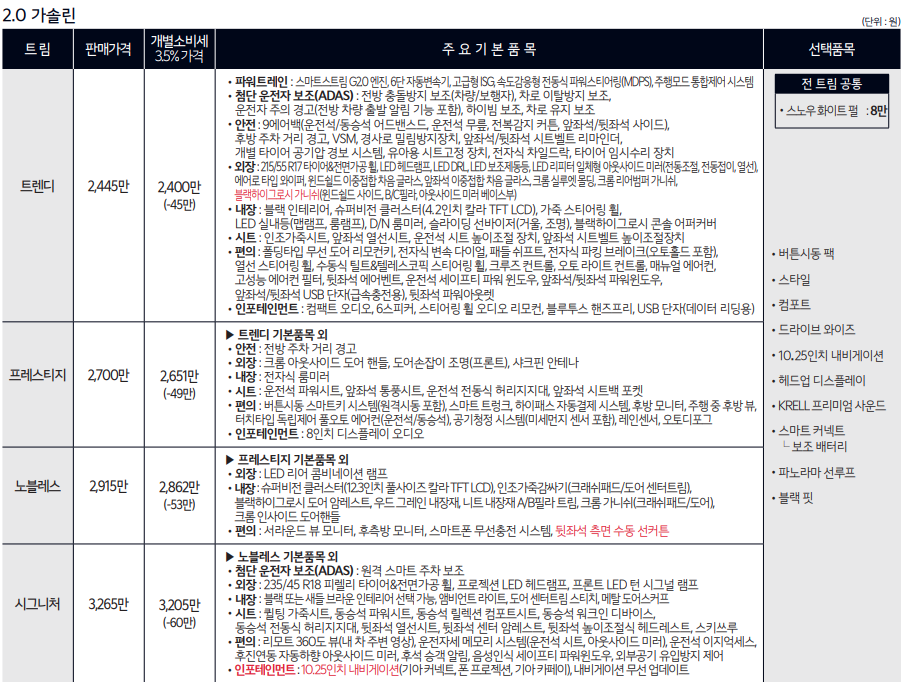 | 구분 | 2.0가솔린 | 1.6터보가솔린 | 2.0하이브리드 | LPG |