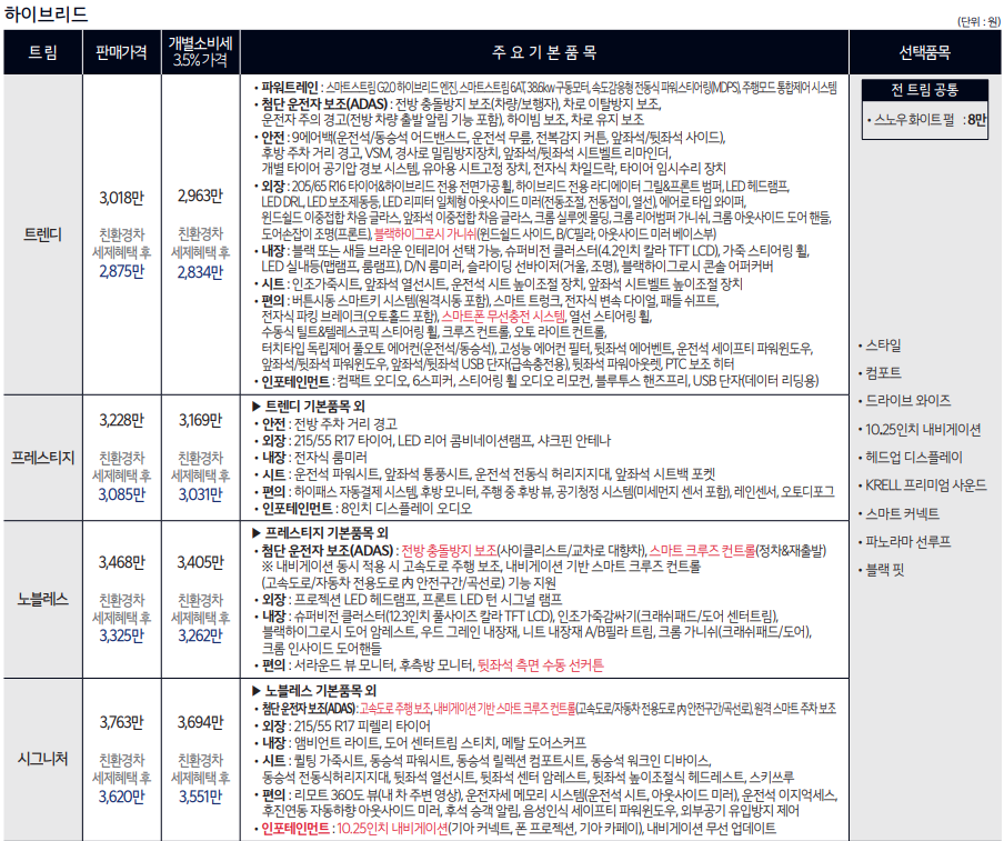 구분 2.0가솔린 1.6터보가솔린 2.0하이브리드 LPG