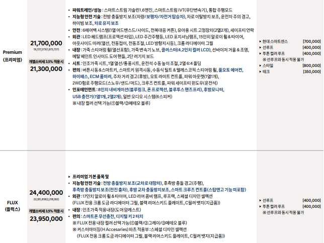 프리미엄과 플럭스 두가지 트림으로 나뉩니다. 플럭스는 좀더 젊은 취향의 포인트를 곳곳에 배치하여 귀엽고 역동적인 느낌을 들게 해줍니다. 프리미엄이 기본트림으로서 스마트센스만 추가하면 충분한 가성비를 누릴수 있겠습니다.