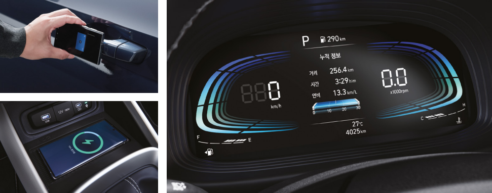 휴대폰을 키대용으로 사용할수 있고, 무선충전기와 일부 디지털클러스터가 적용되었습니다.