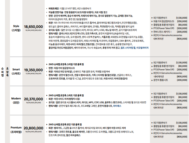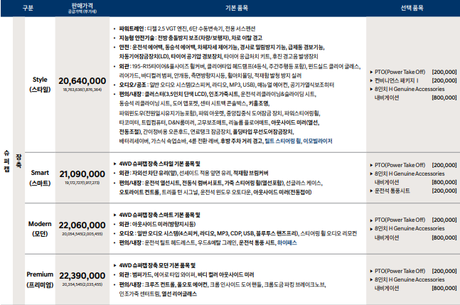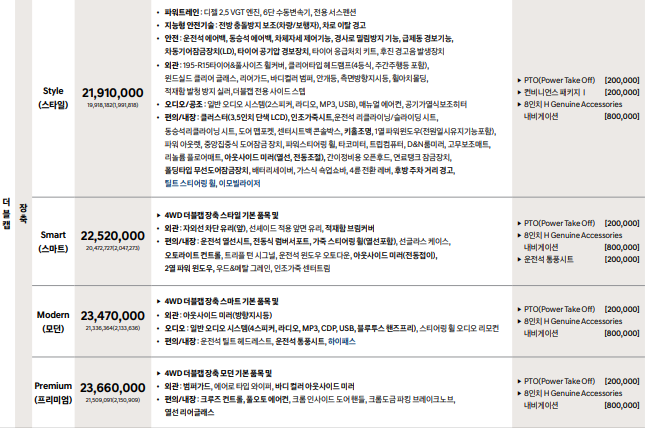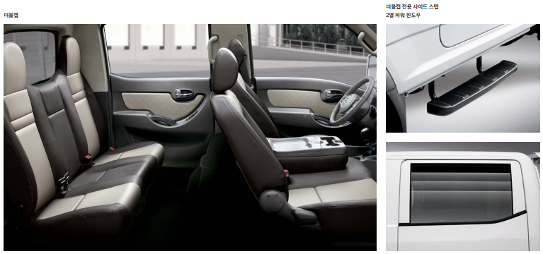 사실 제원은 크게 관심이 없으실것으로 보입니다. 워낙 오랫동안 표준처럼 고정된 사이즈다 보니 일반캡이냐 더블캡이냐 이런부분만 확인하시면 되겠네요. 현재 디젤2.5에 이륜 사륜 두가지 버전으로 나오고 있습니다. 수동변속기가 기본이며 자동변속기는 옵션으로 제공이 됩니다.