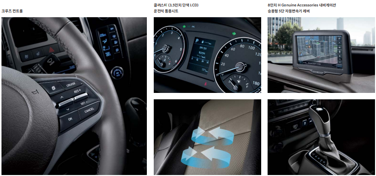 크루즈컨트롤 자동5단변속기 운전석 통풍시트, 네비게이션등 옵션으로 제공됩니다.