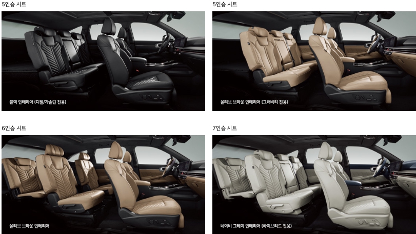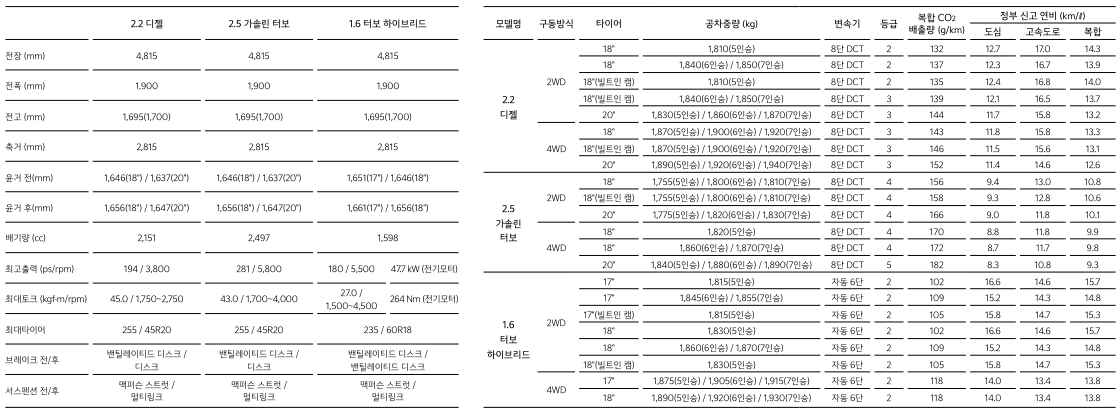 기본적으로 엔진과 기타 기능은 23년식과 동일합니다. 4미터80에 달하는 길이와 1.9미터의 폭은 공간에 있어서 전혀 부족함이 없습니다. 엔진은 2.2디젤, 2.5 가솔린 터보, 1.6터보 하이브리드 3가지 입니다. 1.6 터보하이브리드가 제일 인기가 있고, 2.2디젤모델은 이전과 다르게 인기가 많이 줄었네요. 아무래도 환경요인과 유지보수에서 마이너스지 않았나 생각이 듭니다. 연비는 복합기준 디젤은 14키로정도, 2.5가솔린 10~12정도, 1.6터보하이브리드는 13~15정도입니다. 덩치를 생각하면 상당히 준수한 수준이라고 볼수 있겠네요.