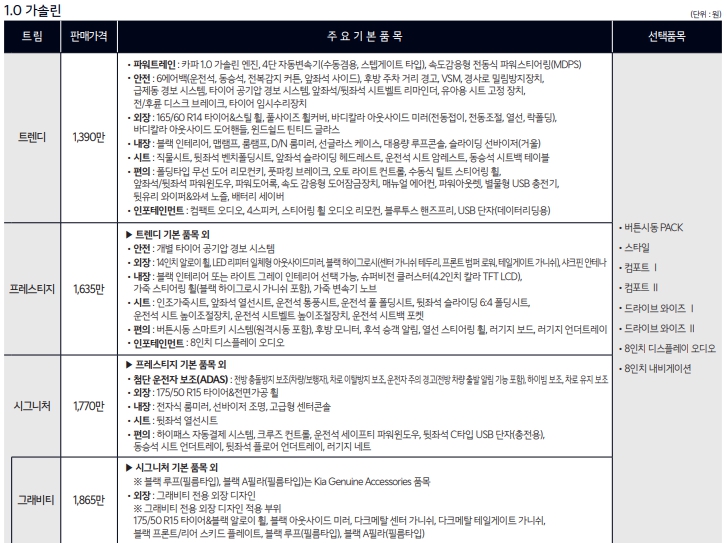일반적인 1.0 가솔린 승용모델입니다. 가격은 소폭 인상이 되었습니다. 외장칼라의 추가가 있습니다. 옵션추천은 드라이브와이즈와 네비게이션은 필수라고 할수 있겠네요.