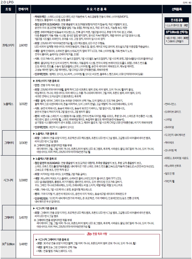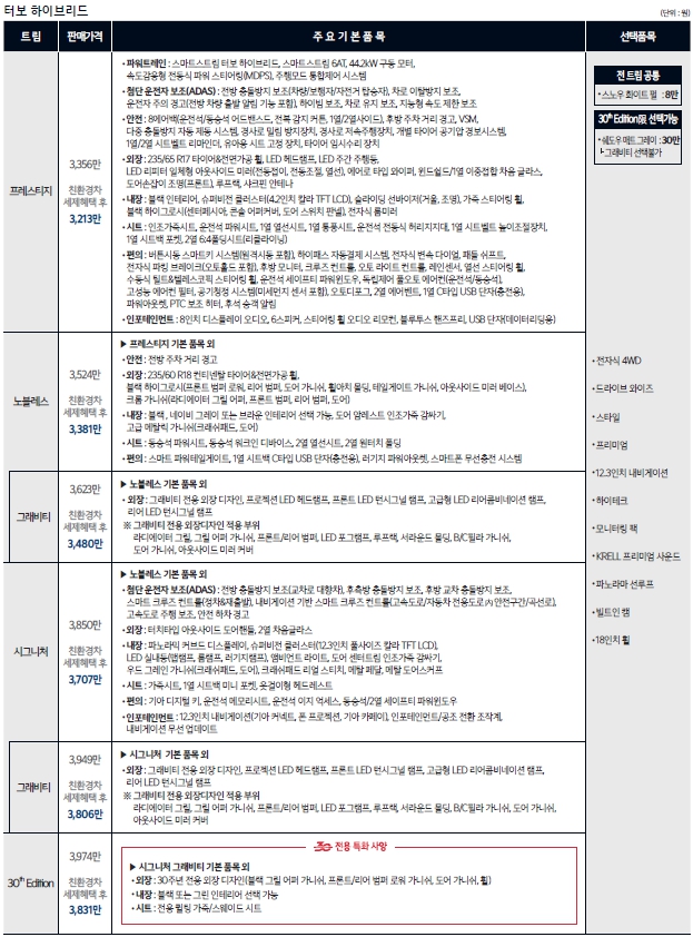 사양은 동일합니다. 가솔린터보와 디젤 LPG 하이브리드까지 넣을수 있는 사양은 모두 있는편이죠. 특히 하이브리드의 판매고가 상당히 많은 모델이기도 합니다. 대기수요가 많이 줄었다고 해도 현재도 6개월이상은 기다려야 받을수 있습니다. 내연기관모델은 1개월이면 가능하죠.