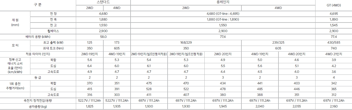 스탠다드와 롱레인지의 가격차는 400정도 입니다. 주행거리는 50~100키로정도 늘어나는데요. 모터의 용량과 힘에서도 약간의 차이가 있어서 이왕이면 여러모로 롱레인지가 좋아보입니다. 전기차는 뭐니뭐니해도 보조금 가능여부입니다. 보조금은 23년에 최대 680만원에서 24년은 650만원으로 약간 줄었습니다. 차량가격이 5500만원이하일때 최대 보조금을 받으므로 GT모델은 최대로 받을수 없습니다. 국가에서 지급하는 보조금외에 지자체에서 제공하는 보조금이 상당히 중요할것인데요. 실시간으로 지자체 보조금여부를 확인해보시기 바랍니다.