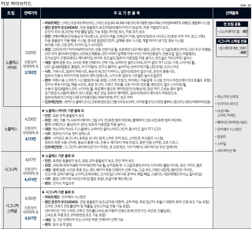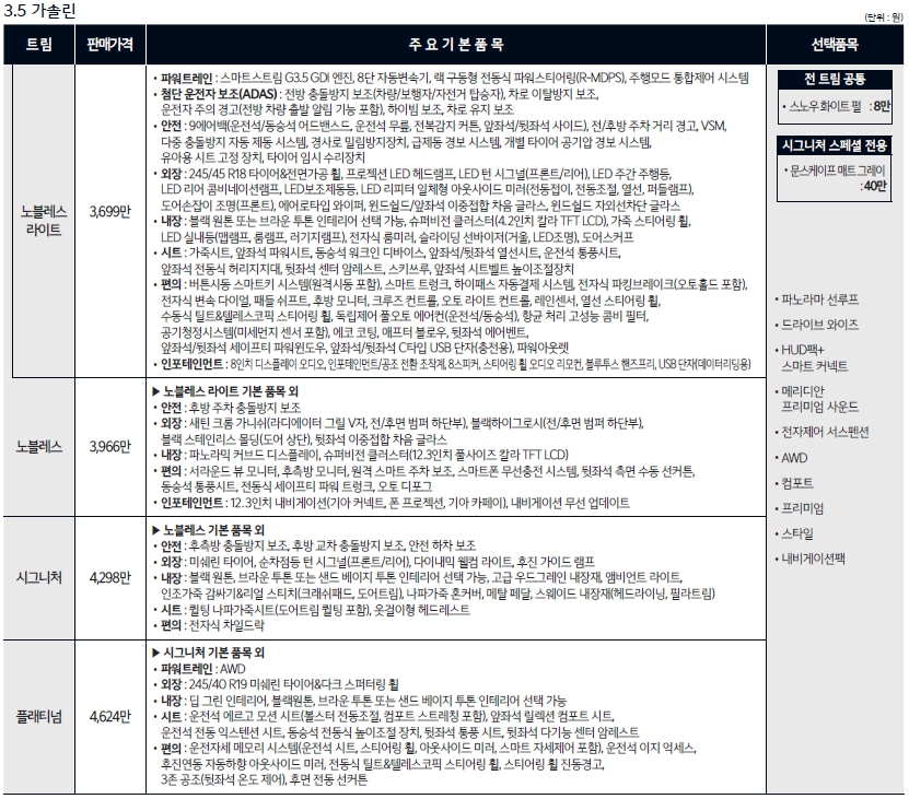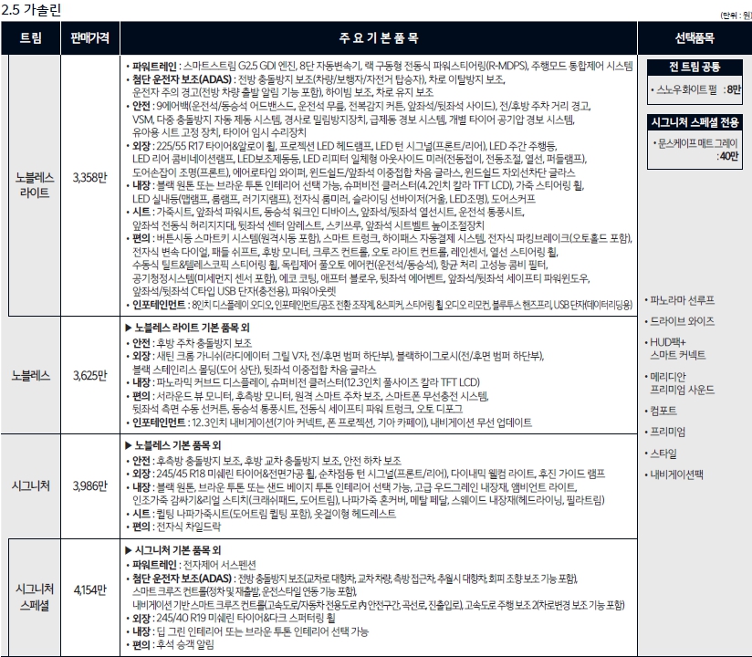 각 엔진트림별로 가격이 다릅니다. 25만원씩 올랐다고 보시면 되고요. 전체적으로 엔진제외하면 구성은 거의 같습니다. 각 트림에서 시그니처에 드라이브와이즈, 네비게이션팩 이 제일 가성비가 좋아보입니다. 기아자동차는 시그니처트림에 가서야 내장이나 옵션이 풍부해지기때문에 개인적으로는 시그니처트림에 옵션넣는걸 선호합니다.