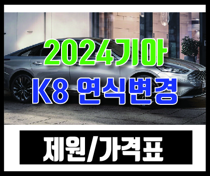 이번에 2024년식 기아 K8이 조용히 출시가 되었습니다. 큰 변화는 없지만 공조에코코팅, 항균처리 콤비필터가 전트림 기본으로 탑재가 되면서 가격은 25만원정도 올랐습니다. 소소하게 몰딩정도만 수정이 있고 휠디자인이 추가되었습니다. 기존에도 워낙 경쟁력이 있다보니 큰폭의 변화는 없었고, 아무래도 그랜저와의 경쟁에서 쳐지지 않기위해 소폭의 상승만 가져간것 같습니다. 그렇다면 2024년식 K8의 가격과 제원등을 알아보도록 하겠습니다.