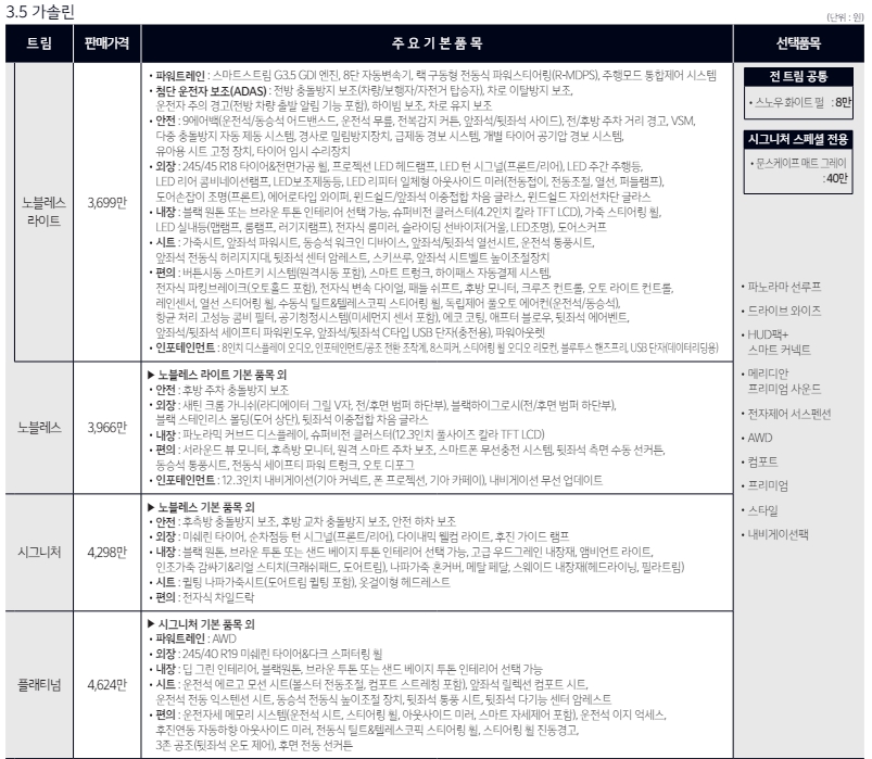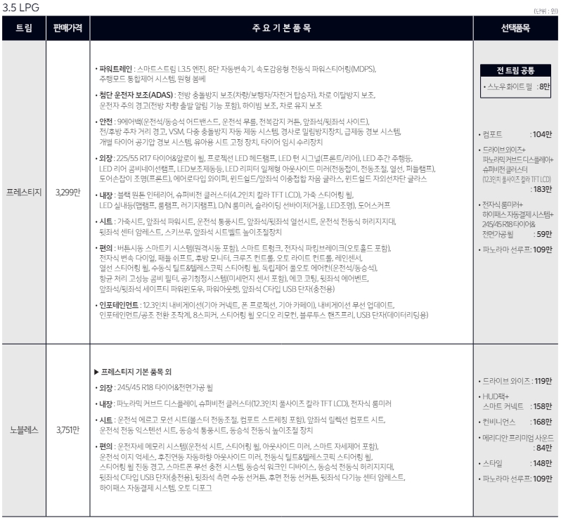 LPG 모델은 사실 존재의 이유가 뭔지 조금 궁금하기는 합니다. (택시용으로 쓰일까요?) 가솔린2.5모델에 비해 100만원가량 저렴한데요. 그럼에도 불구하고 3.5모델이기때문에 차량세금문제도 있고, 여러모로 선호하는 트림은 아닌듯합니다.