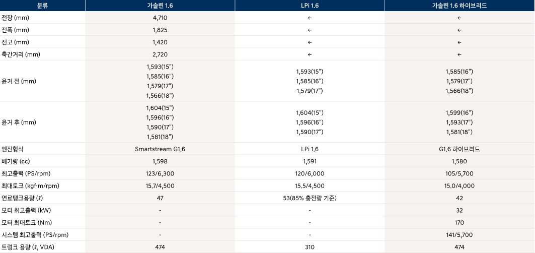 가솔린 1.6에 대한 가격표입니다. 기존 가격에서 대략 10~20만원정도 상승하였습니다. 나머지는 모두 동일합니다.