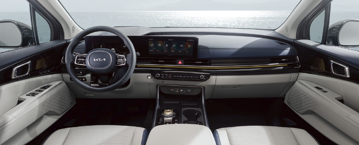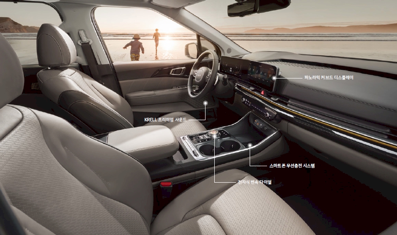 실내는 일자 크브드디스플레이를 채택했습니다. 현재 거의 모든 현대기아차량의 후속모델로 커브드혹은 일자모니터를 적용하고 있습니다.