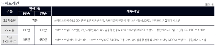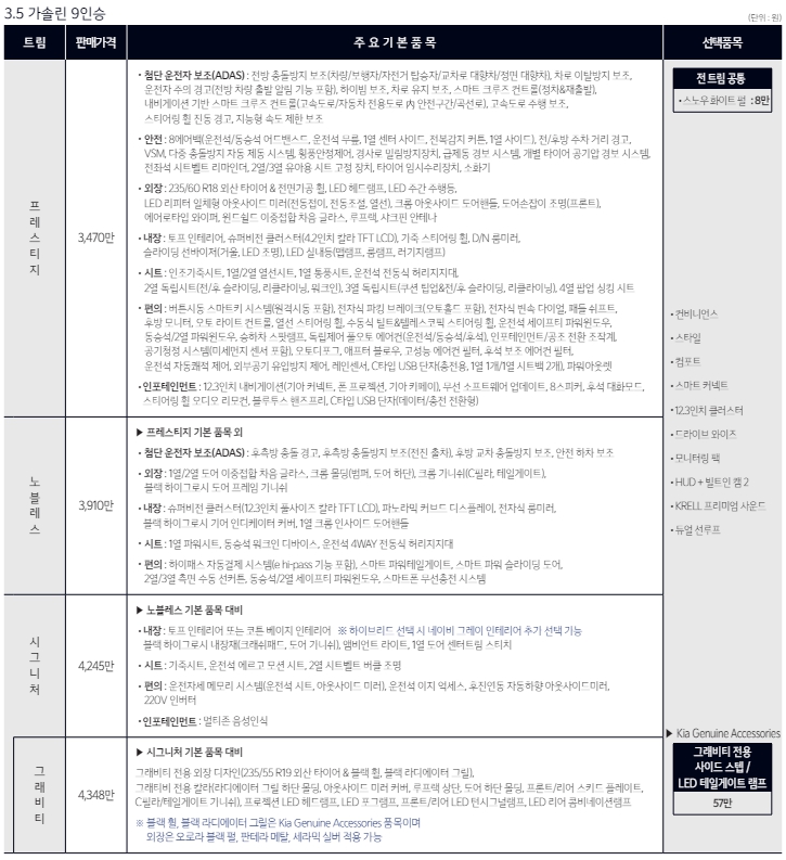 기본적으로 트림은 동일합니다. 파워트레인을 선택하고 트림을 고르는 방식인데요. 기본은 3.5가솔린사양입니다. 2.2디젤및 하이브리드를 선택시에는 추가금이 붙는데요. 하이브리드는 9인승 455만원, 7인승은 450만원이 추가됩니다. 어떤걸 고르더라도 운행상 스트레스는 적을 것으로 보입니다. 옵션으로는 드라이브와이즈와 빌트인캠2를 추천드립니다.