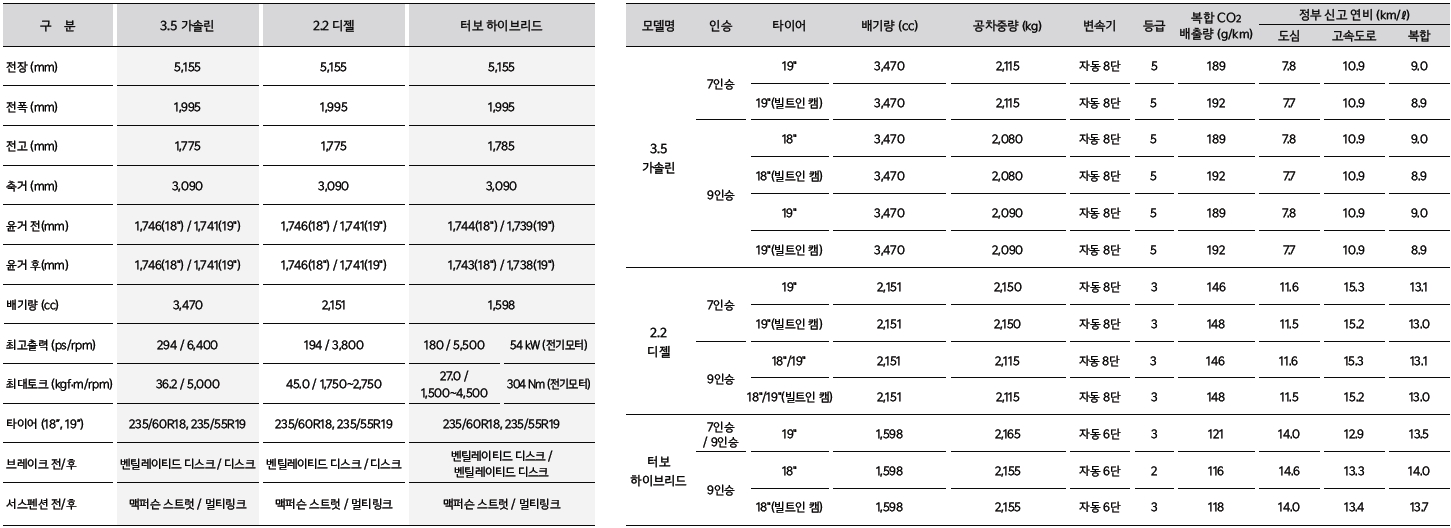 크기는 하이브리드와 일반 내연기관의 차이는 크지않습니다. 높이에서만 조금 차이가 있을뿐이죠. 파워트레인은 3.5가솔린, 2.2디젤, 가솔린 하이브리드 3가지입니다. 3.5가솔린은 294마력에 36.2토크의 스펙으로 부족하지 않습니다. 2.2디젤은 194마력에 45토크인데요. 기존의 공명음 이슈는 현재진행형인지 확인할 필요는 있겠네요. 터보하이브리드는 1.6타보가솔린에 모터를 붙인 하이브리드인데요. 최고출력 180마력의 터보엔진입니다. 하이브리드를 적용하는 큰 이유는 바로 연비일텐데요. 하이브리드의 연비는 복합 13~14키로를 나타냈습니다. 3.5가솔린의 8~9키로, 2.2디젤의 13키로대보다 좋습니다. 기본적으로 차량세금이 적기때문에 확실한 이점이 있습니다.