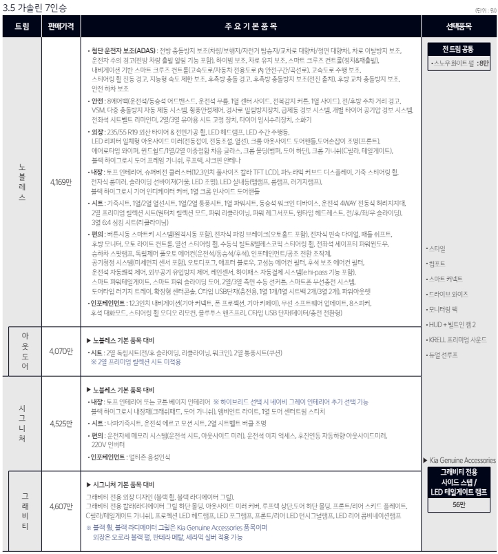 기본적으로 트림은 동일합니다. 파워트레인을 선택하고 트림을 고르는 방식인데요. 기본은 3.5가솔린사양입니다. 2.2디젤및 하이브리드를 선택시에는 추가금이 붙는데요. 하이브리드는 9인승 455만원, 7인승은 450만원이 추가됩니다. 어떤걸 고르더라도 운행상 스트레스는 적을 것으로 보입니다. 옵션으로는 드라이브와이즈와 빌트인캠2를 추천드립니다.