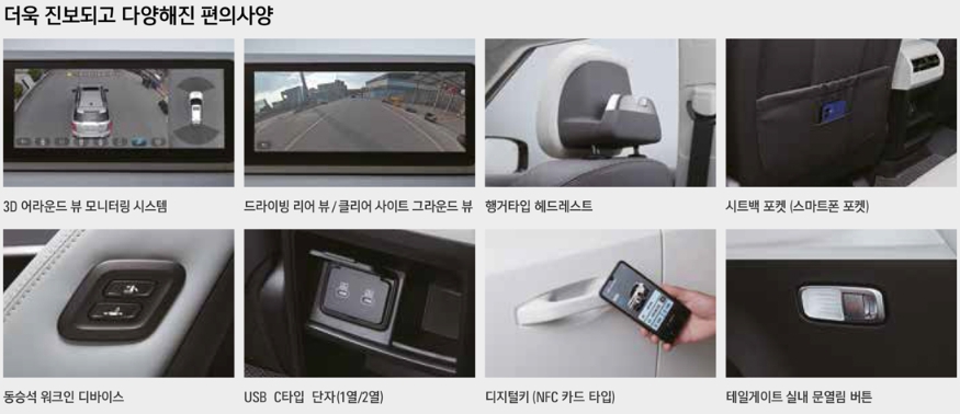 기존모델에 없었던 3D 어라운드뷰가 옵션으로 제공됩니다. 덩치가 큰 SUV 모델들은 사실 어라운드뷰가 필수옵션이 되고 있는데요. 이번에 3D 어라운드뷰가 제공되면서 한층 좋은 차량으로 거듭나게 되었습니다. 또한 디지털키추가와 앞좌석 뒤쪽에 옷걸이형상의 헤드레스트가 추가되면서 한층 사용성이 좋아졌습니다.