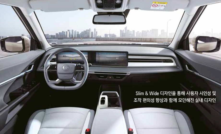 신형 토레스의 가장큰 변화는 바로 실내인데요. 특히나 기존에 생뚱맞던 중앙 모니터부분이 계기판과 일체형으로 변경이 되면서 큰 변화가 생겼습니다.